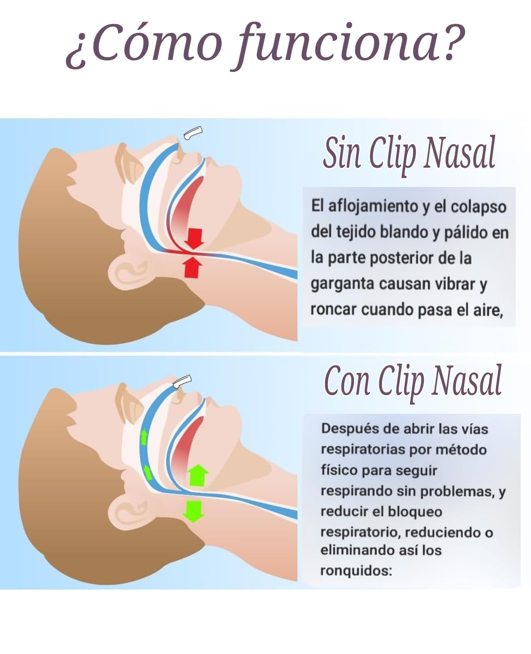 La congestión nasal puede ser causada por muchos factores, como alergias, rinitis alérgicas, sinusitis… Este clip nasal , mejora la circulación de aire en las fosas nasales, lo que permite respirar libremente por la nariz para que no respires por la boca. El poco aire que aún puede pasar se acelera. Y hace vibrar los tejidos profundamente en la garganta, causando ruido: ¡ronquidos!