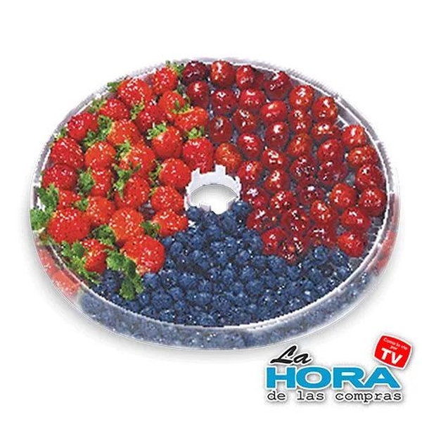 Modo de uso: Coloca los alimentos cortados en las bandejas sin que se superpongan. Ajusta la temperatura entre 35 °C y 70 °C según el tipo de alimento. Enciende el equipo y deja funcionar entre 4 y 12 horas dependiendo del grosor y humedad del producto. Revisa periódicamente y apaga al finalizar.