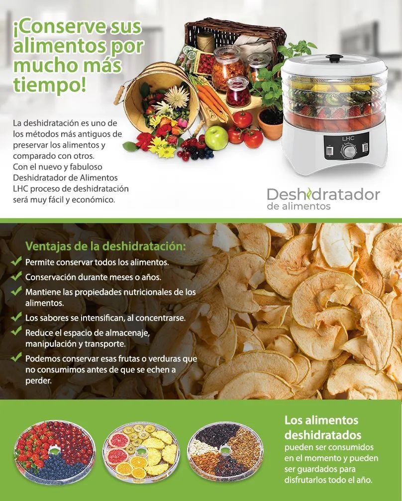 Descripción del producto: El Deshidratador LHC es un electrodoméstico compacto y eficiente para conservar alimentos mediante deshidratación. Cuenta con 4 bandejas apilables que permiten secar frutas, verduras, carnes y hierbas de forma uniforme. Su sistema de ventilación distribuye el calor de manera constante, manteniendo los nutrientes y sabores originales. Ideal para preparar snacks saludables, carne seca, chips de vegetales o frutas deshidratadas en casa.